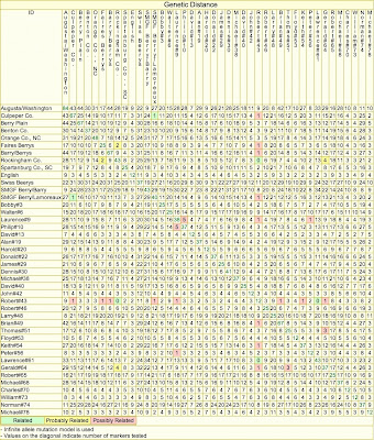 As you can see, we still have the same 12 marker haplotype problem. Whenever you see a haplotype, e.g., Robert, #43, who appears either related or probably related to several others, look to see how many markers were tested. In this case, 12, and by only comparing 12 markers it is difficult to get a distance much over 12, and too easy to get a misleading distance under 3ish, so be wary. Since we're talking about #43 let's use that as an example. According to this table #43 is 'possibly related' to the Culpeper Co. Berrys, the Faires Berrys and the Barry/Berrys. He is also 'possibly related' to the SMGF Berry/Lamoreaux person, to Laurence, #9, to Brian, #49, to Keith, #54, and to Gerald, #64, none of whom, according to the Table, would appear to be related to each other. In addition, according to the Table, #43 is 'related' to the Rockingham Co. Berrys and also to Lawrence, #61. Say what? Lawrence is a Genetic Distance of 13 from the Rockingham Co. Berrys!So much for the 12 marker test problem, let's look at what this Table indicates we should perhaps explore further. We've already noticed that the SMGF Berry/Lamoreaux person is likely a Culpeper Co. Berry and that the Faires Berrys and the Rockingham Co. Berrys may be the same family. Lawrence, #61, who tested 43 markers is a 'Probably Related' distance of 4 from Rockingham Co. Worth a look? Laurence, #9, who has tested 43 markers, is a 'Possibly Related' distance of 5 from Philip, #10, who has tested 37. Philip has just ordered his 67 marker upgrade so that may tell us something more there. Thomas, #51, who has tested 25 markers, is a 'Possibly Related' distance of 3 from Gerald, #64, who has tested 37 markers. In addition, Gerald is a 'Probably Related' distance of 4 from the 43 marker test Rockingham Co. Berrys. So what do you think?